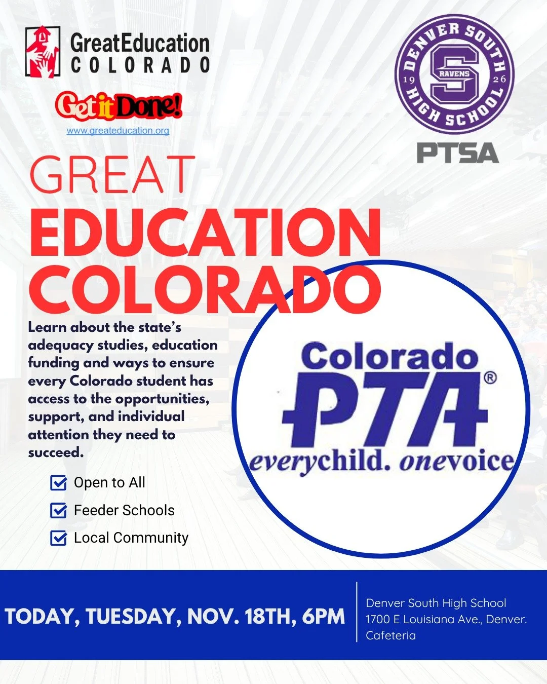 The Denver South PTSA follows the purpose/mission of the National PTA: to make every child’s potential a reality by engaging and empowering families and communities to advocate for all children.